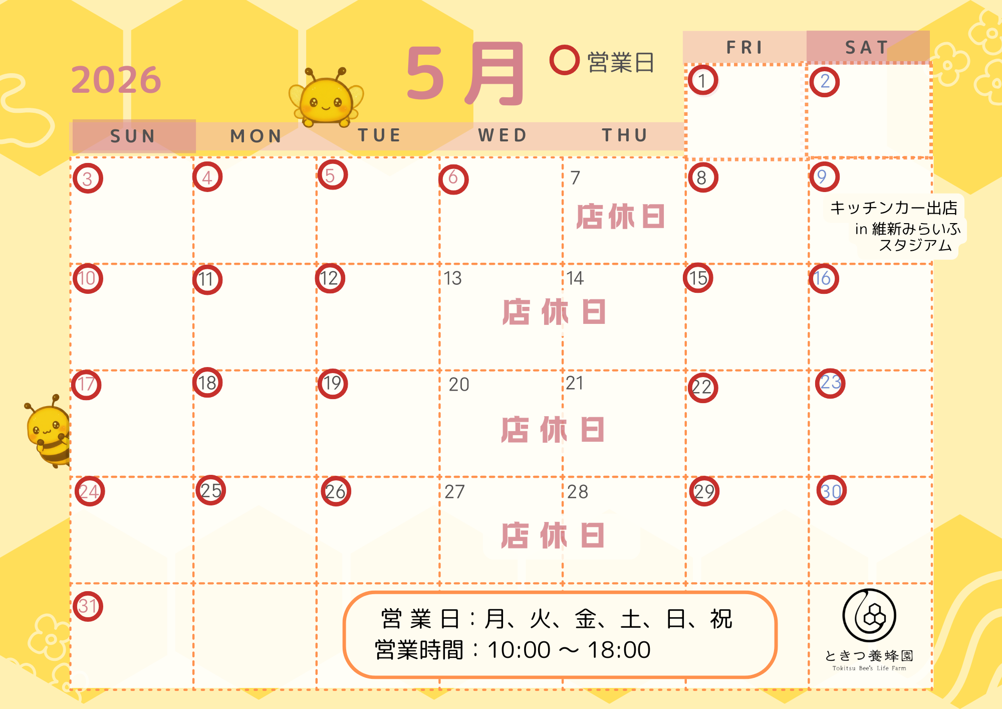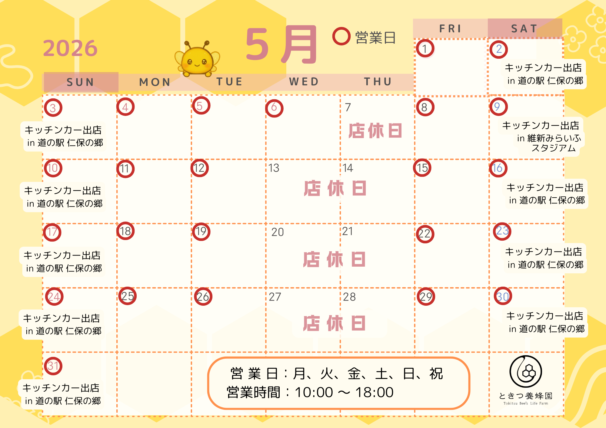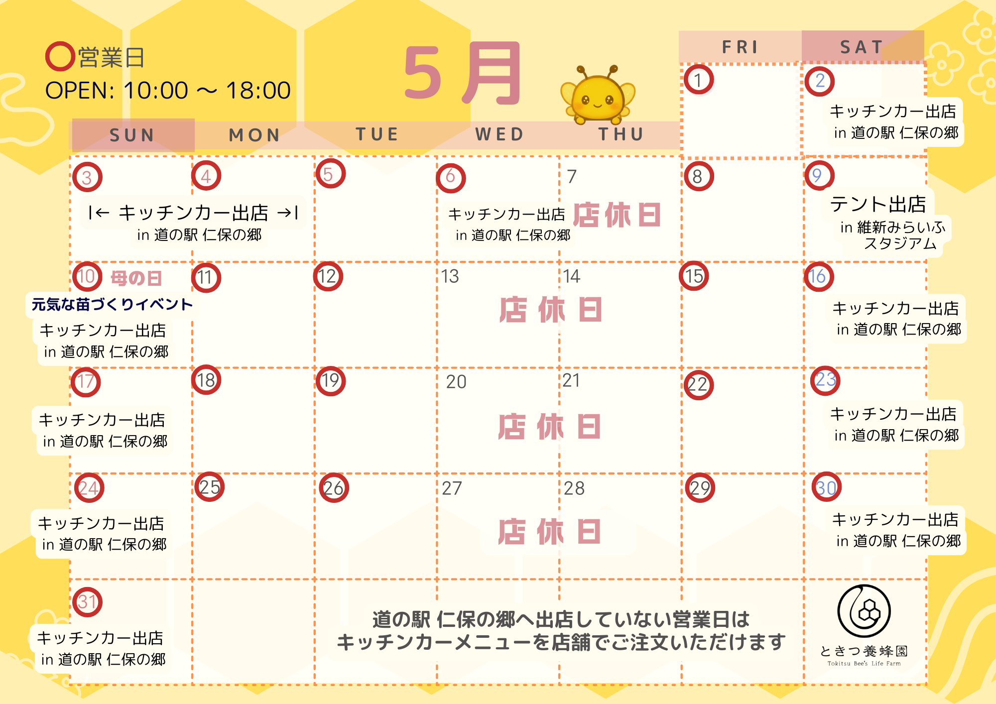 山口市で新規就農者として開業して10年。地元の皆さま、全国のファンの皆様の温かい支えのおかげで、ここまで成長してきました。黄色と紺色の「ミツバチキッチンカー」は県内各地のイベントで注目の的。その場で提供するはちみつスイーツは、毎回行列ができるほど大人気です。