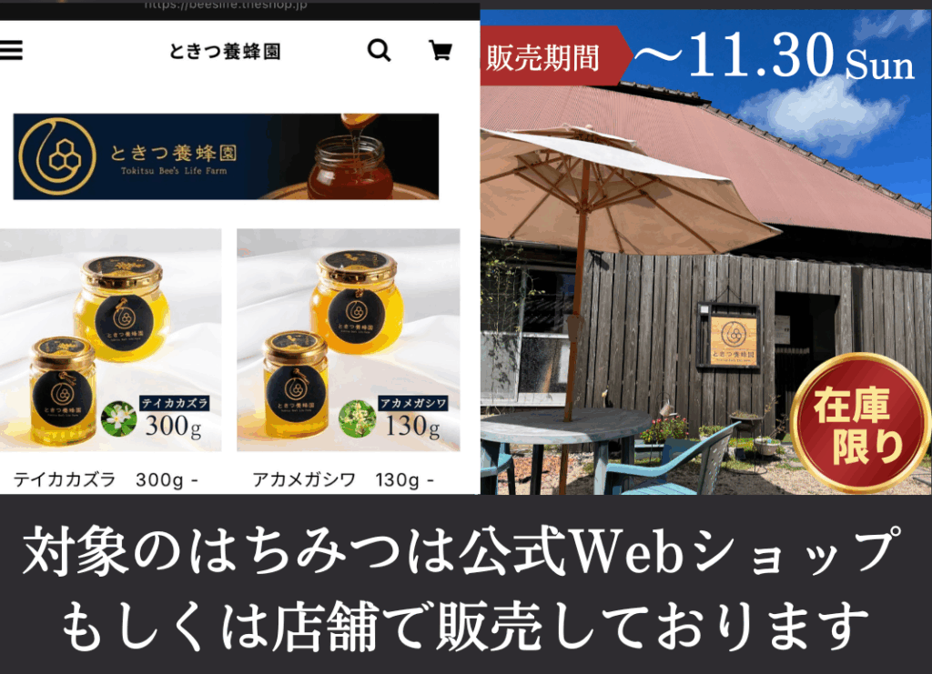 • 対象商品: ときつ養蜂園 公式Webショップおよび実店舗で販売しているはちみつ商品