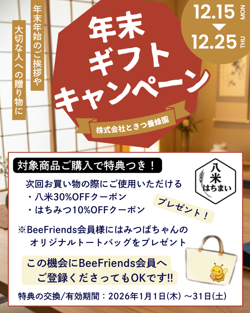 この機会にBeeFriends会員にご入会いただくか、既にご入会いただいているお客様には、今回のギフトキャンペーンで対象商品をお買い上げいただくとオリジナルキャラクターの「みつばちゃんトートバッグ」をもれなくプレゼントいたします。
