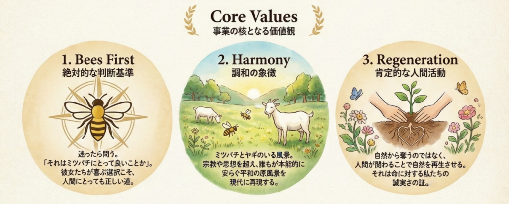 私たちが本当に大切にしているのは、ミツバチたちとの関わり方や飼育の過程に関心をもち、飼育はケミカルフリーであることや、ミツバチの周囲の自然環境を整え、人と自然とが調和ができるように細心の注意を払うことです。