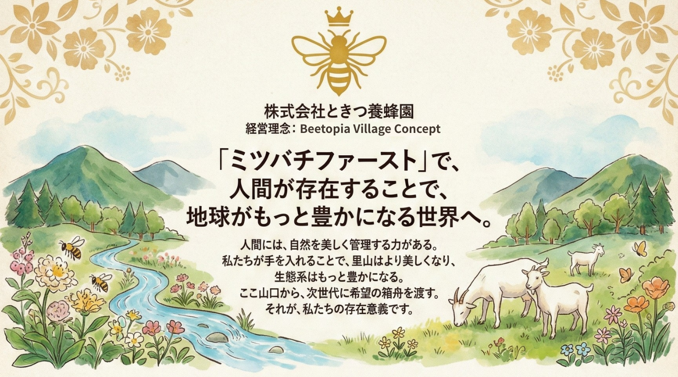 だからこそ、私たちはここ仁保の地で、ミツバチ、ヤギ、そして人間が対等に暮らす「BeeTopia」という新しい箱舟をつくります。